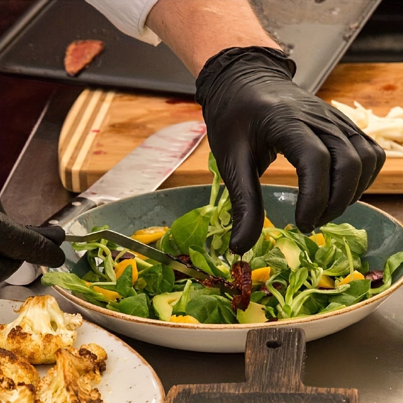 - Matsikker og allsidig – De svarte engangshanskene er matvaregodkjente, lateksfrie, DEHP-frie og er laget av bedre løsninger for personer med sensitiv hud. Vi tilbyr størrelsene medium, large og XL. De er ideelle for hårfarging, industriell bruk, mathåndtering, matlaging, matlaging, grilling, rengjøring, kjøkken og mer.