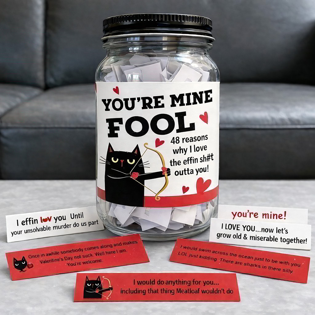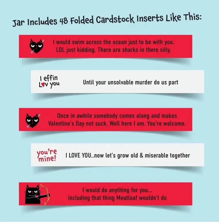 đGlöm klyschiga rosor och förutsĂ€gbara kort. Denna roliga valentindagburk Ă€r för personer som visar sin kĂ€rlek med sarkasm, Ă€rlighet och precis lagom mycket kaos.